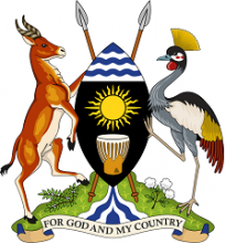 The shield is flanked on the right by a Crested Crane, a subspecies of the Grey-crowned Crane and the national bird of Uganda. On the left is the Ugandan Kob, a species of Kob that here represents abundant wildlife.